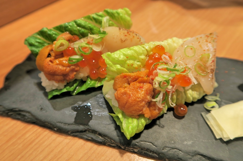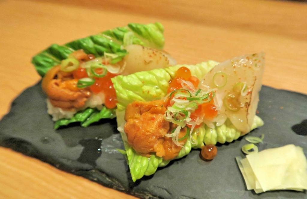 蘿蔓葉上載著干貝、馬糞海膽、鮭魚卵,剛上桌還真令人不知該如何下“口“