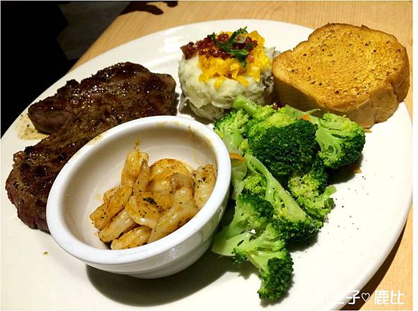 搭配馬鈴薯泥、時蔬,自費加價的香蒜萊姆鮮蝦,營養豐富又美味