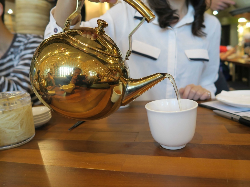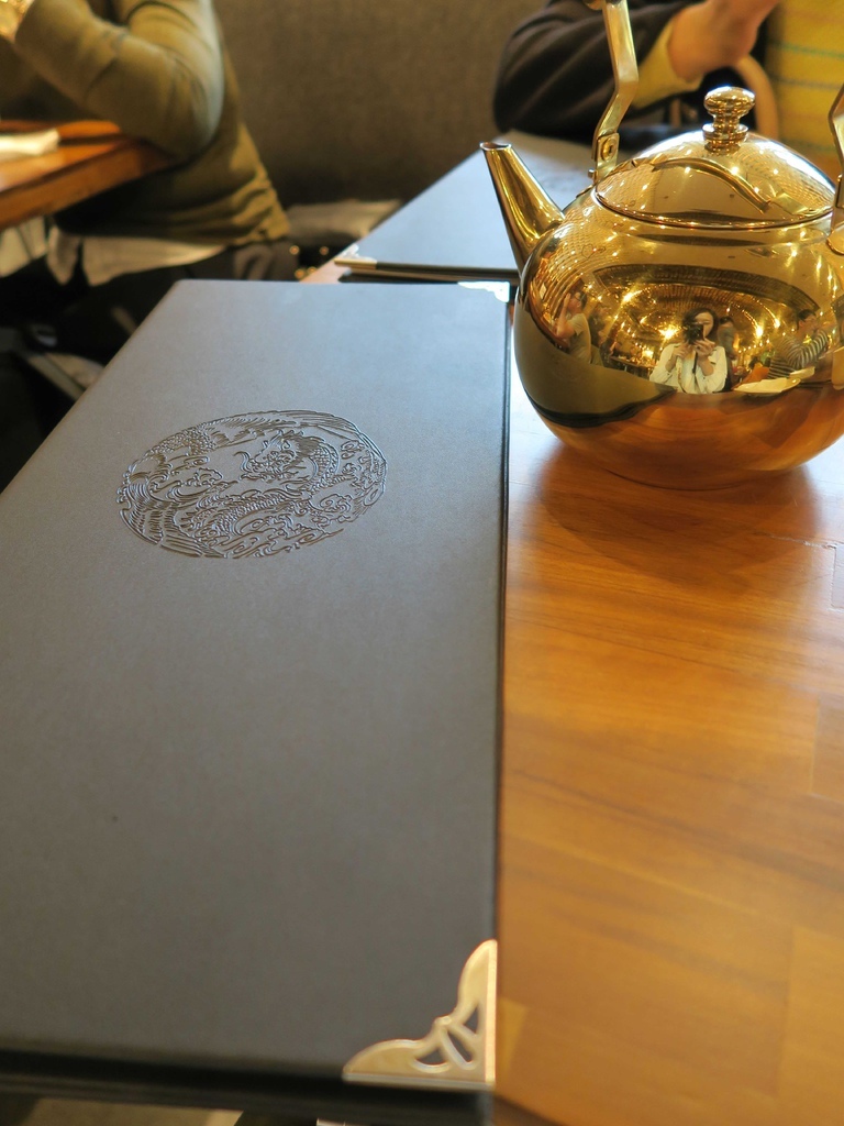 封面雕著一頭龍的沉重菜單,配上亮金金水壺