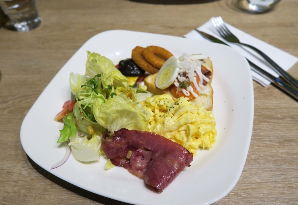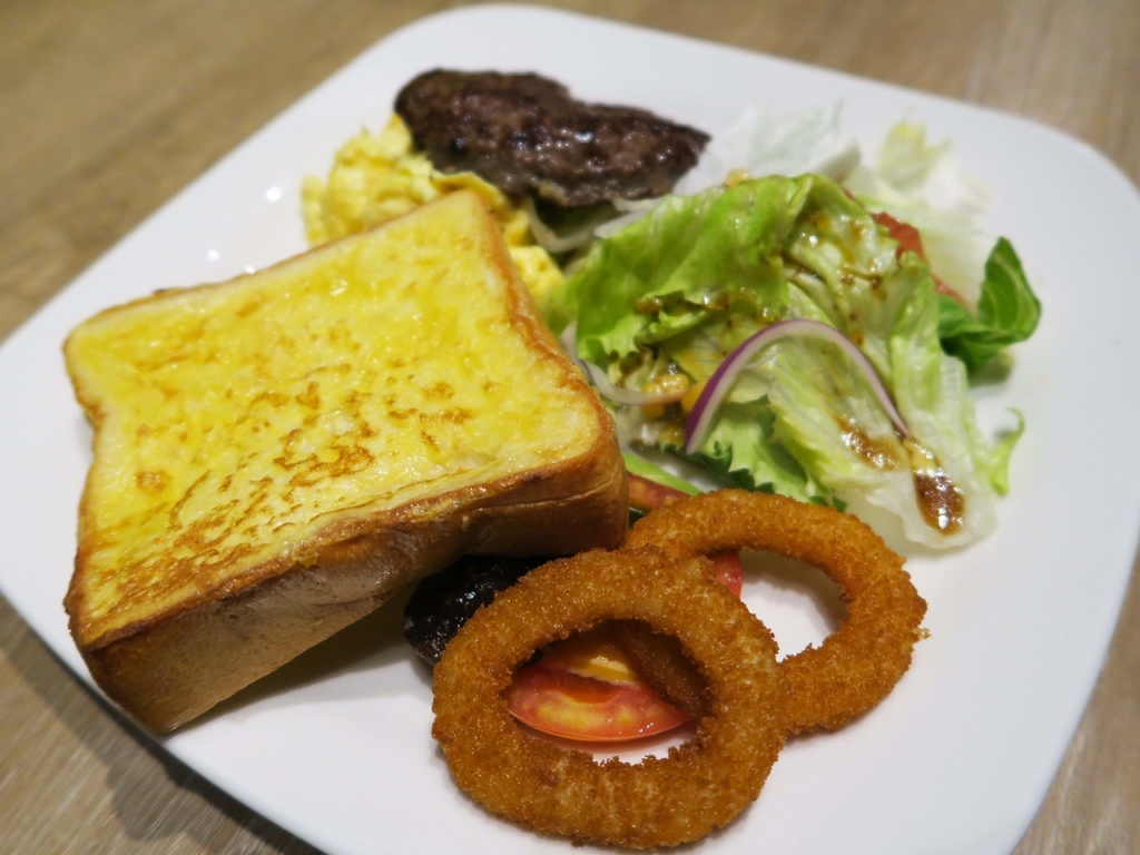 內含烘烤沾蛋吐司、美式漢堡肉、香菇、牛番茄、洋蔥圈、西式炒蛋、沙拉