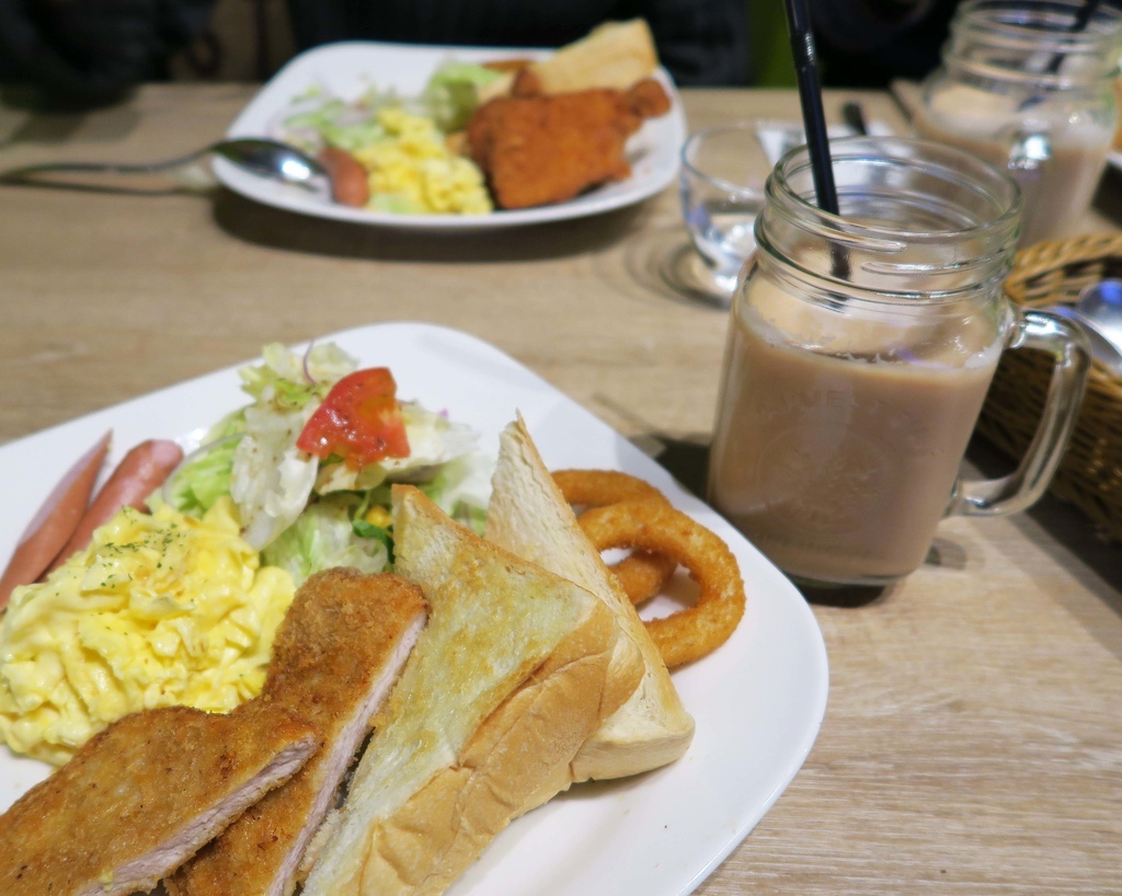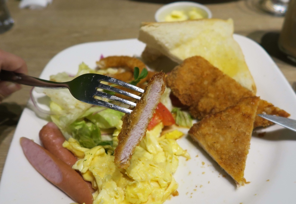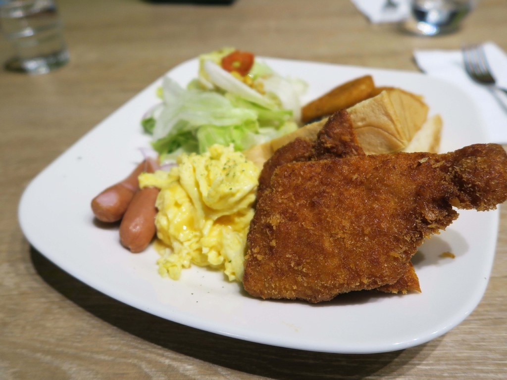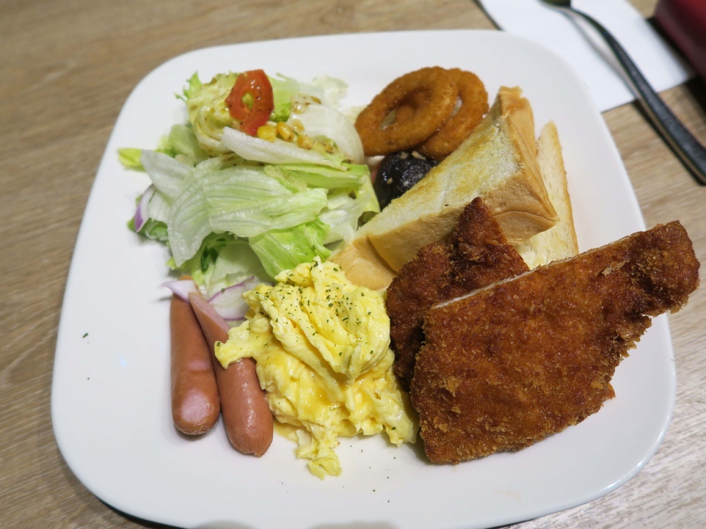 含黃金豬排、奶油吐司、德式香腸、香菇、牛番茄、洋蔥圈、西式炒蛋、沙拉