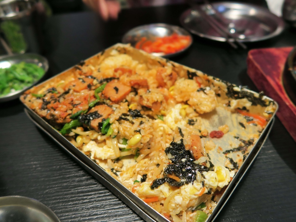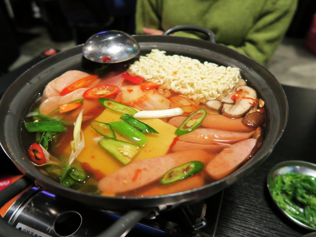 由泡菜、火腿、香腸、焗豆、豆腐與泡麵組成,與傳統韓國辣醬調味