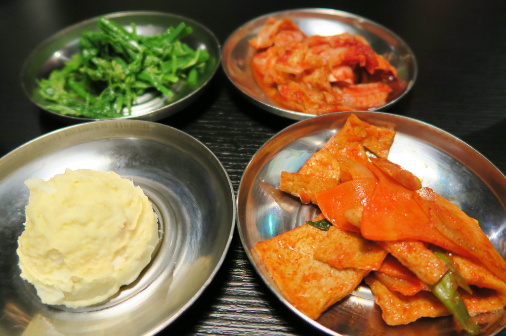 四盤分別是龍鬚菜、泡菜、馬鈴薯泥 跟好像豆皮類的東西