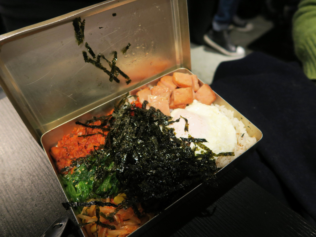 配料有和包蛋、火腿、海苔、泡菜、波菜、辣豆芽小黃瓜