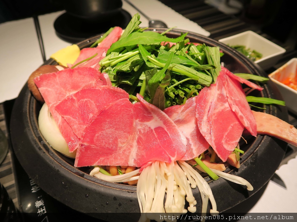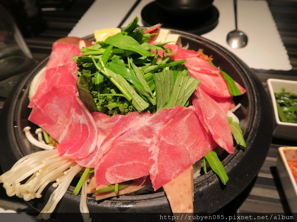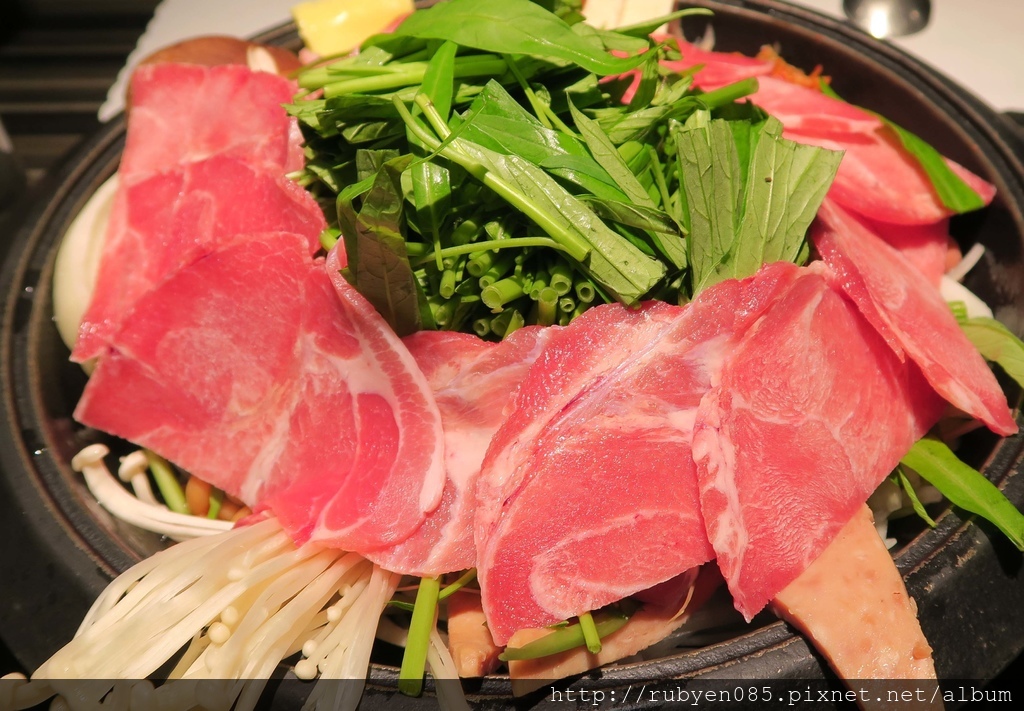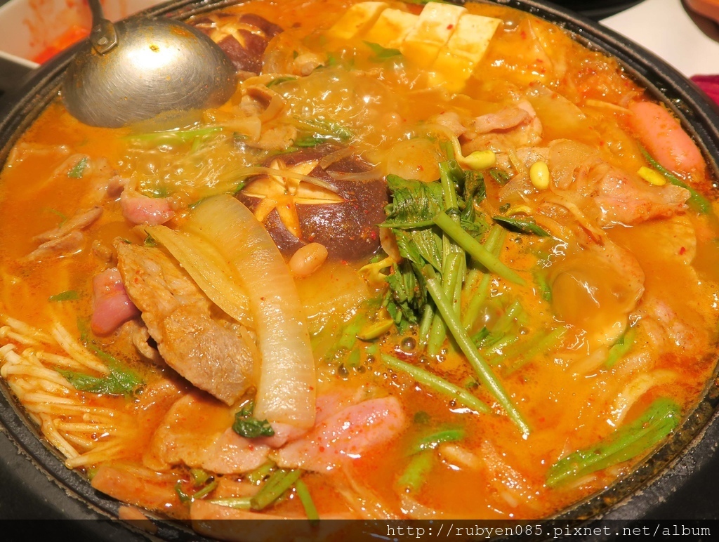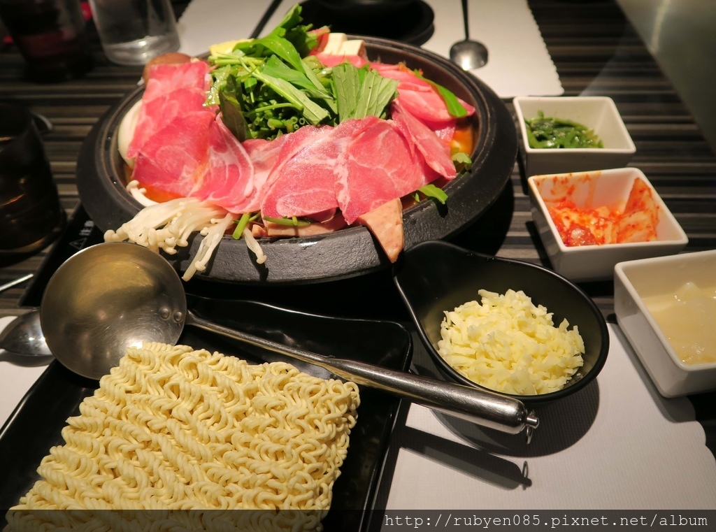 部隊鍋內有梅花肉片、空心菜、豆腐、起司