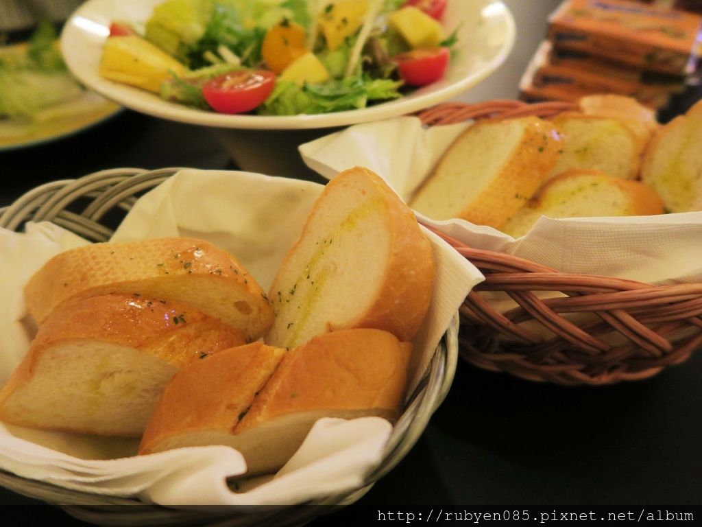 一旁附送3片大蒜麵包,即使單純沾著異國風味湯汁吃也很棒