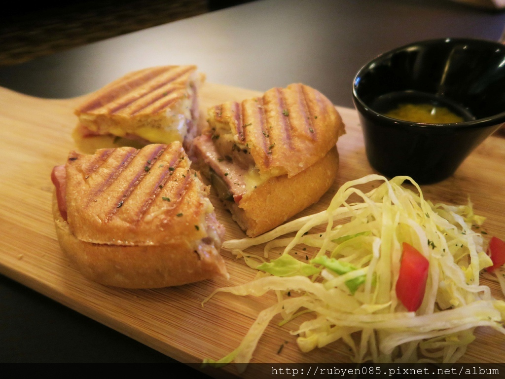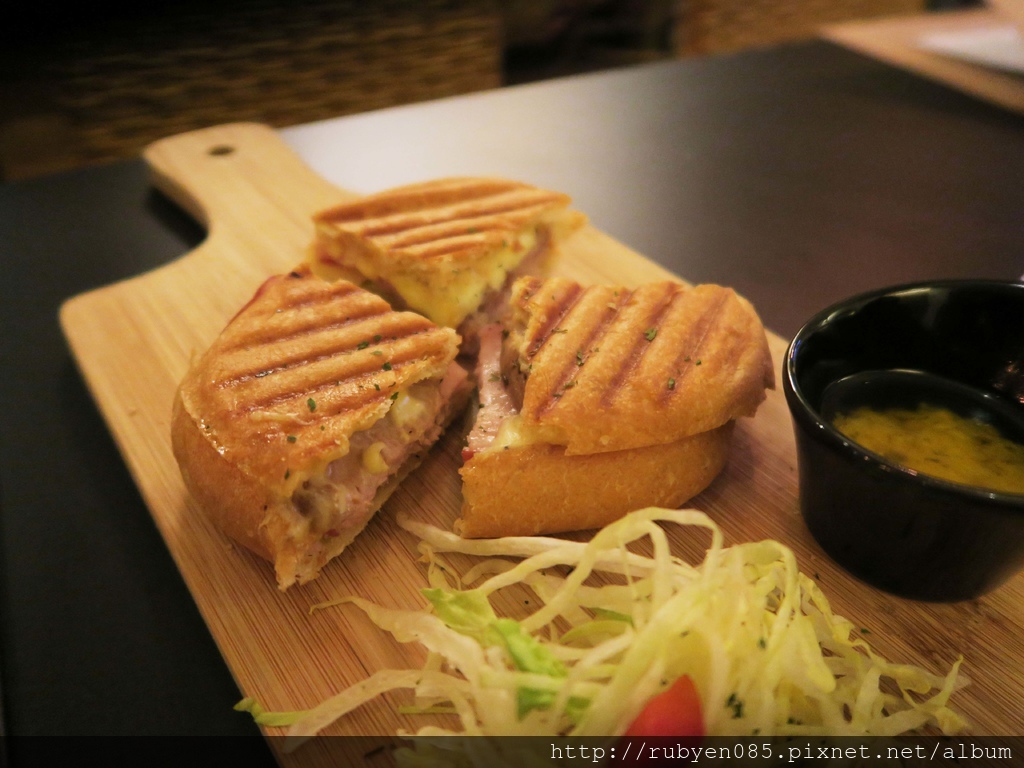 古巴三明治外皮像是麵包,裡面鋪上起司、厚片火腿、玉米、酸黃瓜,再拿去烤壓出斜紋線條