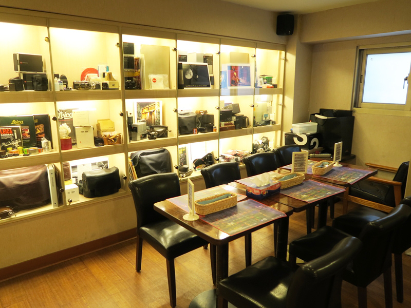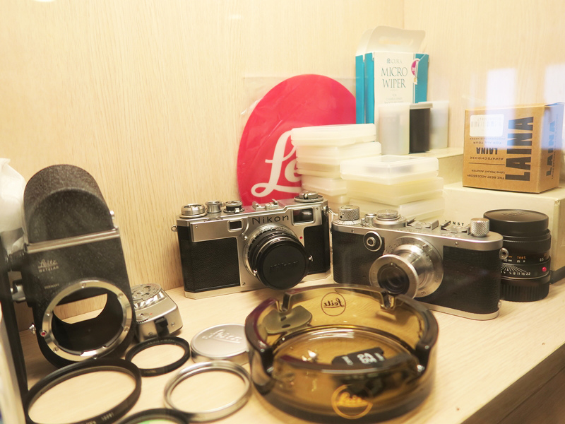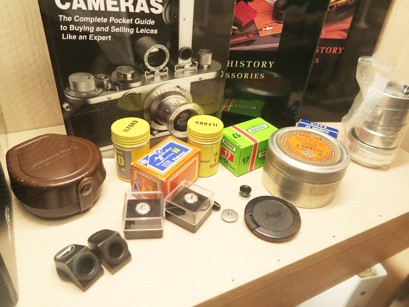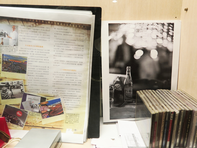 一旁的整面櫥窗格裡,展示著許多Leica相機以及各式各樣的攝影器材、書刊