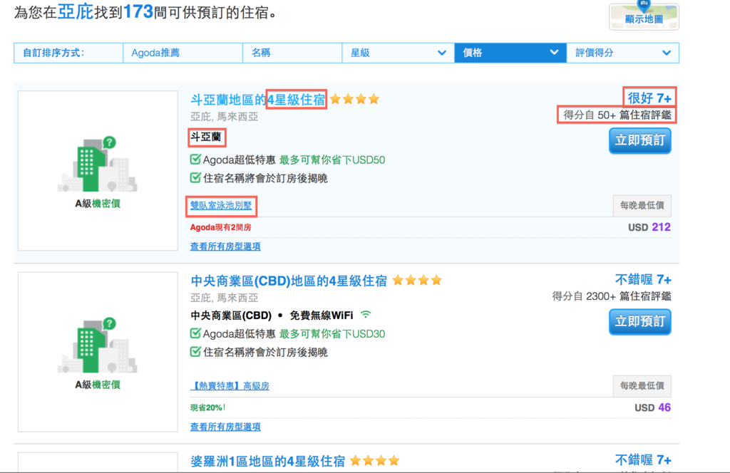 然後在畫面左方塞選出相同區域、相同星級、相同評價得分數的飯店