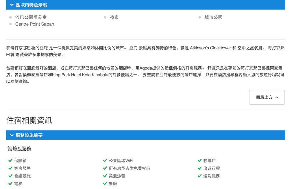 點進去後可以看到大致房型、區域內特色景點、飯店設施