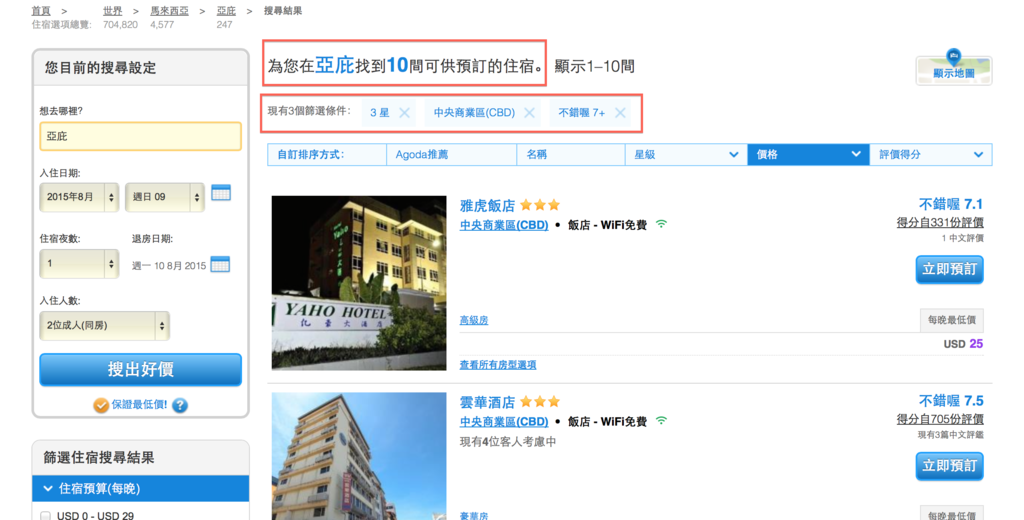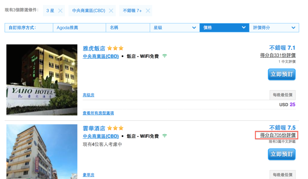 然後我會依照區域、評分、價格,找到有願意入住的飯店,才會再點進去